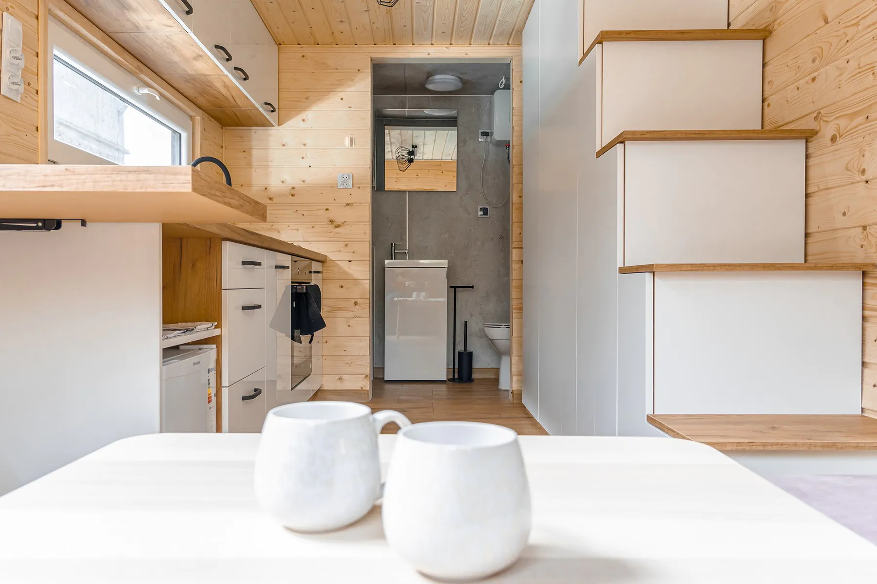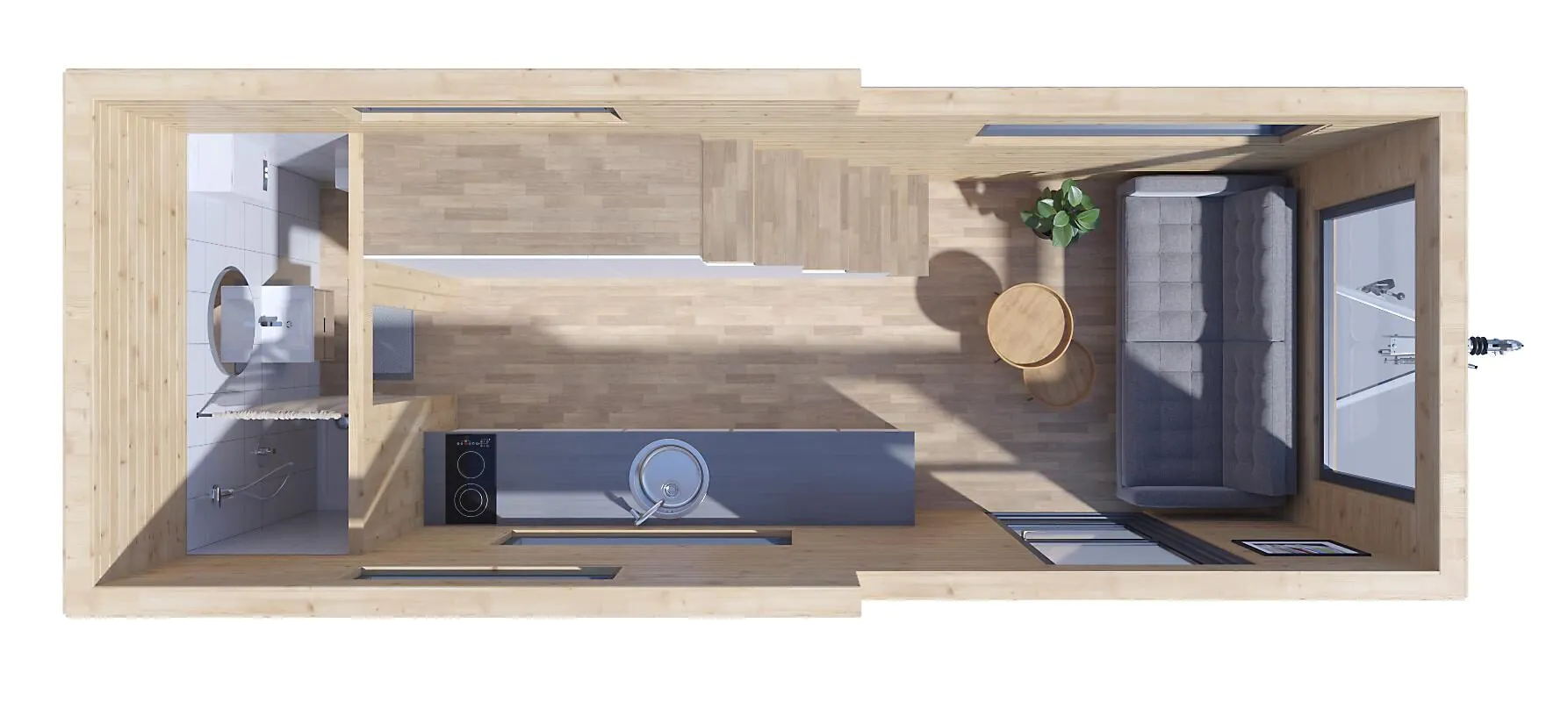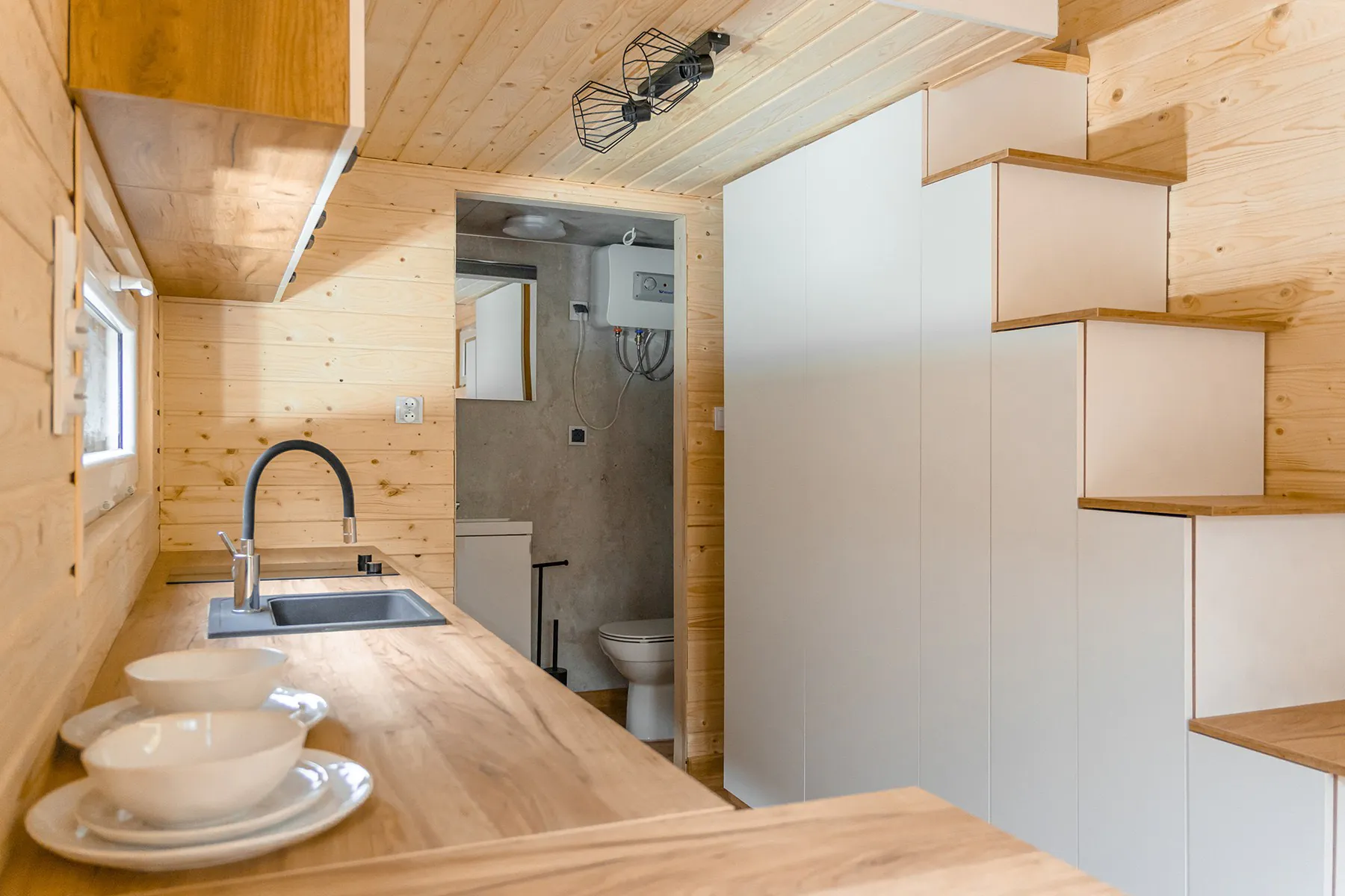 Tiny house Arona posiada parter z niewielką, ale w pełni funkcjonalną łazienką oraz salon z aneksem kuchennym i dużą kanapą, która może również służyć do spania. Natomiast główna sypialnia znajduje się na antresoli, oszczędzając tym samym miejsce. Dzięki temu produkowane przez nad domki mobilne spełniają wszystkie podstawowe potrzeby mieszkaniowe, i to bez rezygnowania z wygody. Dodatkowo możesz zdecydować się na zakup tiny house w wersji premium, czyli w pełni wyposażony dom mobilny. Stan pod klucz obejmuje m.in. kompletną łazienkę i kuchnię oraz stylowe meble.