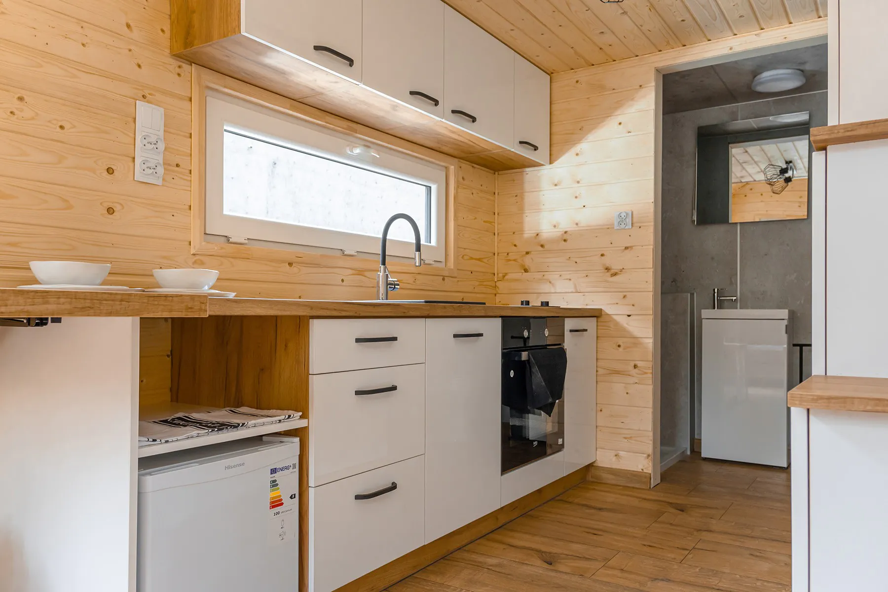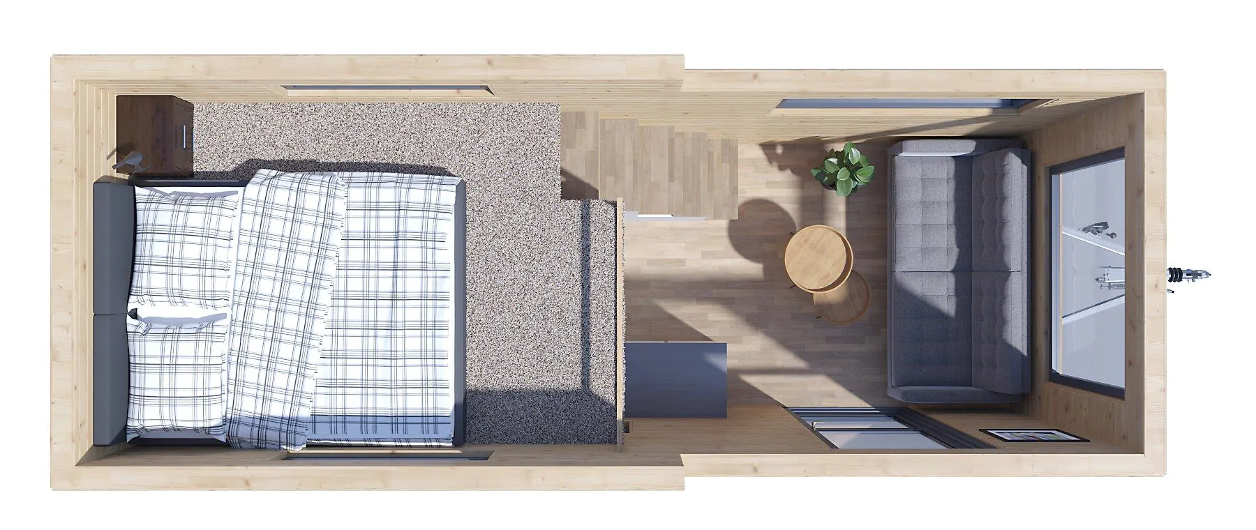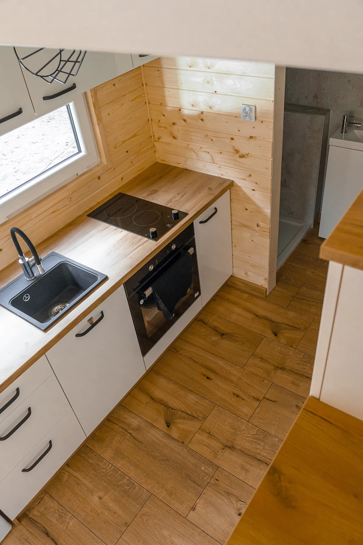 Tiny house Arona posiada parter z niewielką, ale w pełni funkcjonalną łazienką oraz salon z aneksem kuchennym i dużą kanapą, która może również służyć do spania. Natomiast główna sypialnia znajduje się na antresoli, oszczędzając tym samym miejsce. Dzięki temu produkowane przez nad domki mobilne spełniają wszystkie podstawowe potrzeby mieszkaniowe, i to bez rezygnowania z wygody. Dodatkowo możesz zdecydować się na zakup tiny house w wersji premium, czyli w pełni wyposażony dom mobilny. Stan pod klucz obejmuje m.in. kompletną łazienkę i kuchnię oraz stylowe meble.