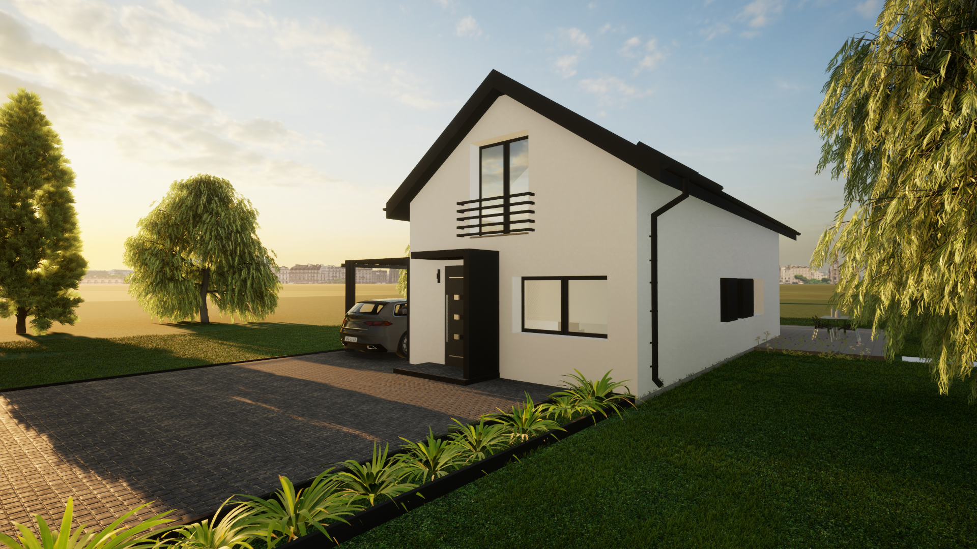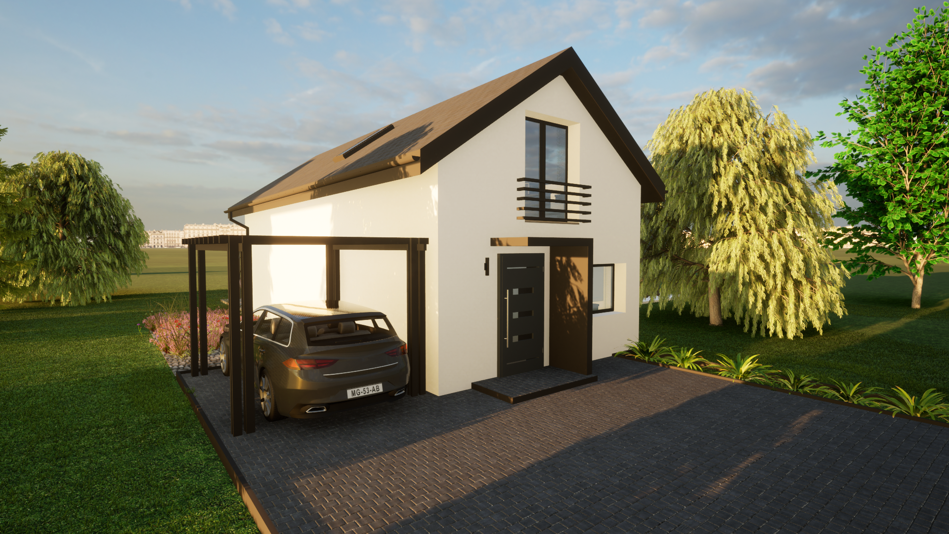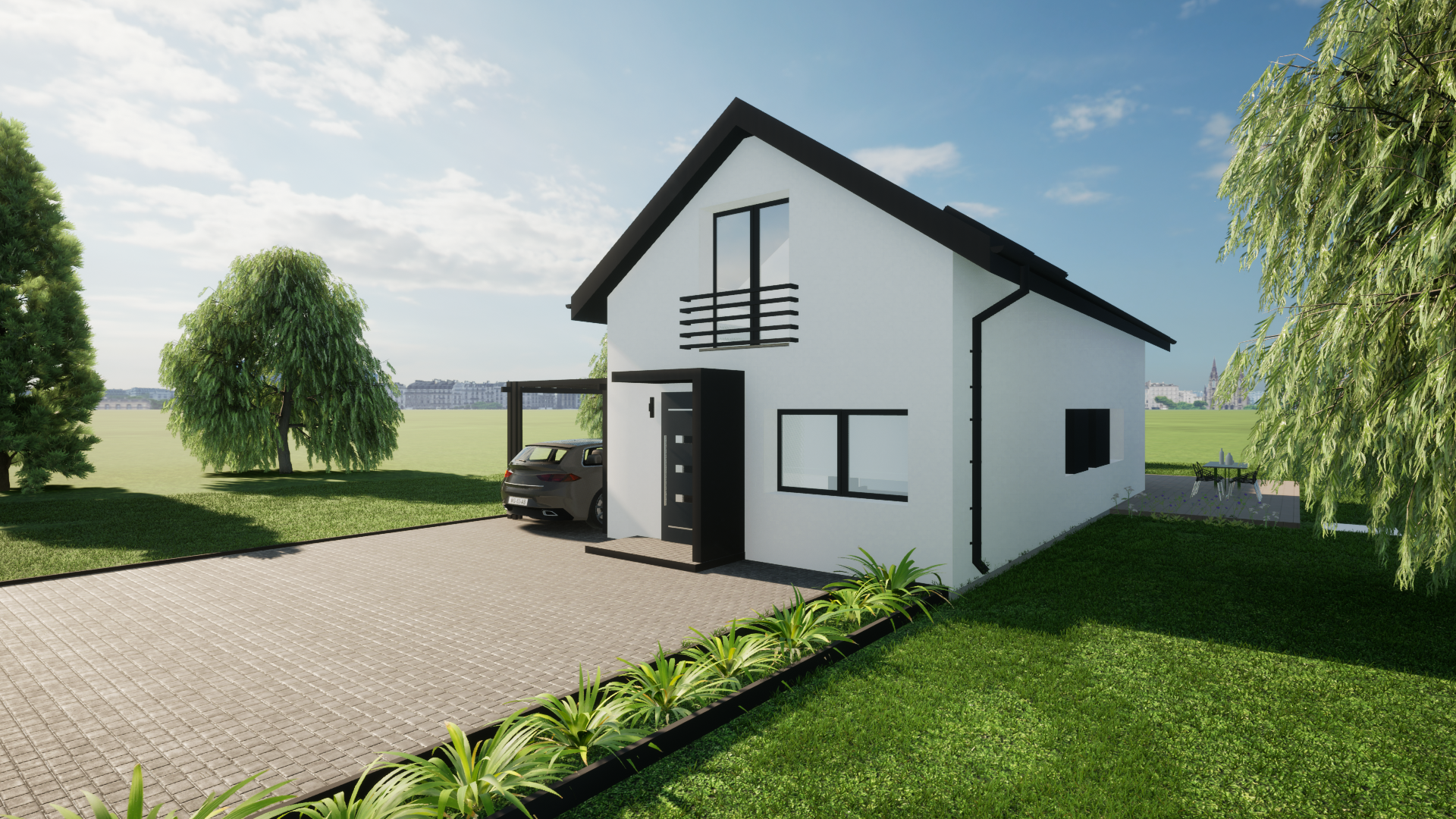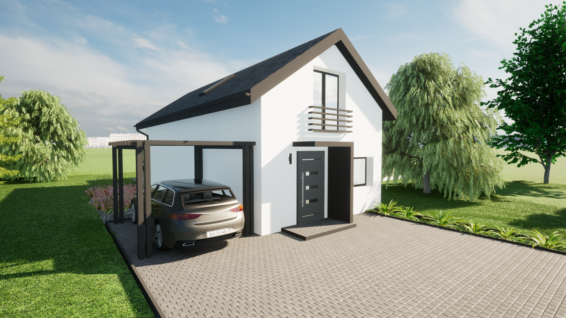 jako dom całoroczny z nowoczesną bryłą i możliwością stworzenia wygodnej strefy tarasowej oraz zadaszenia miejsca postojowego