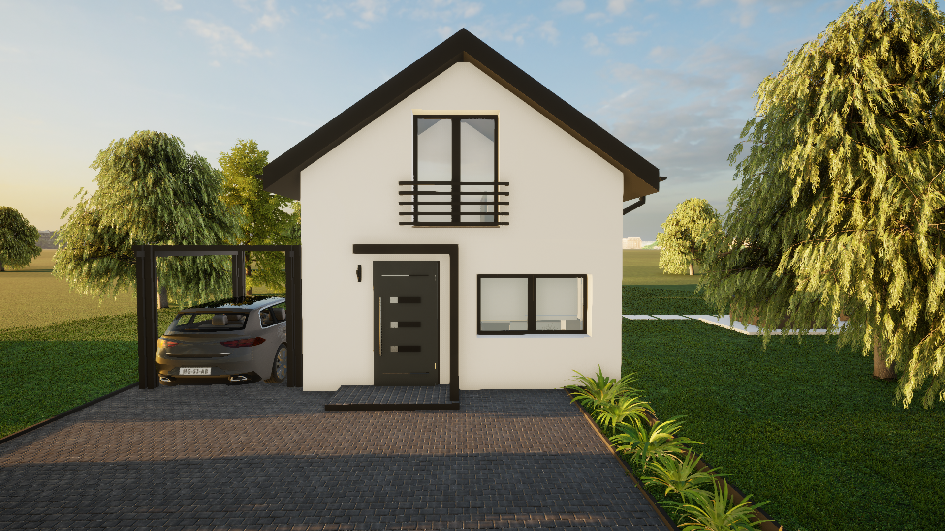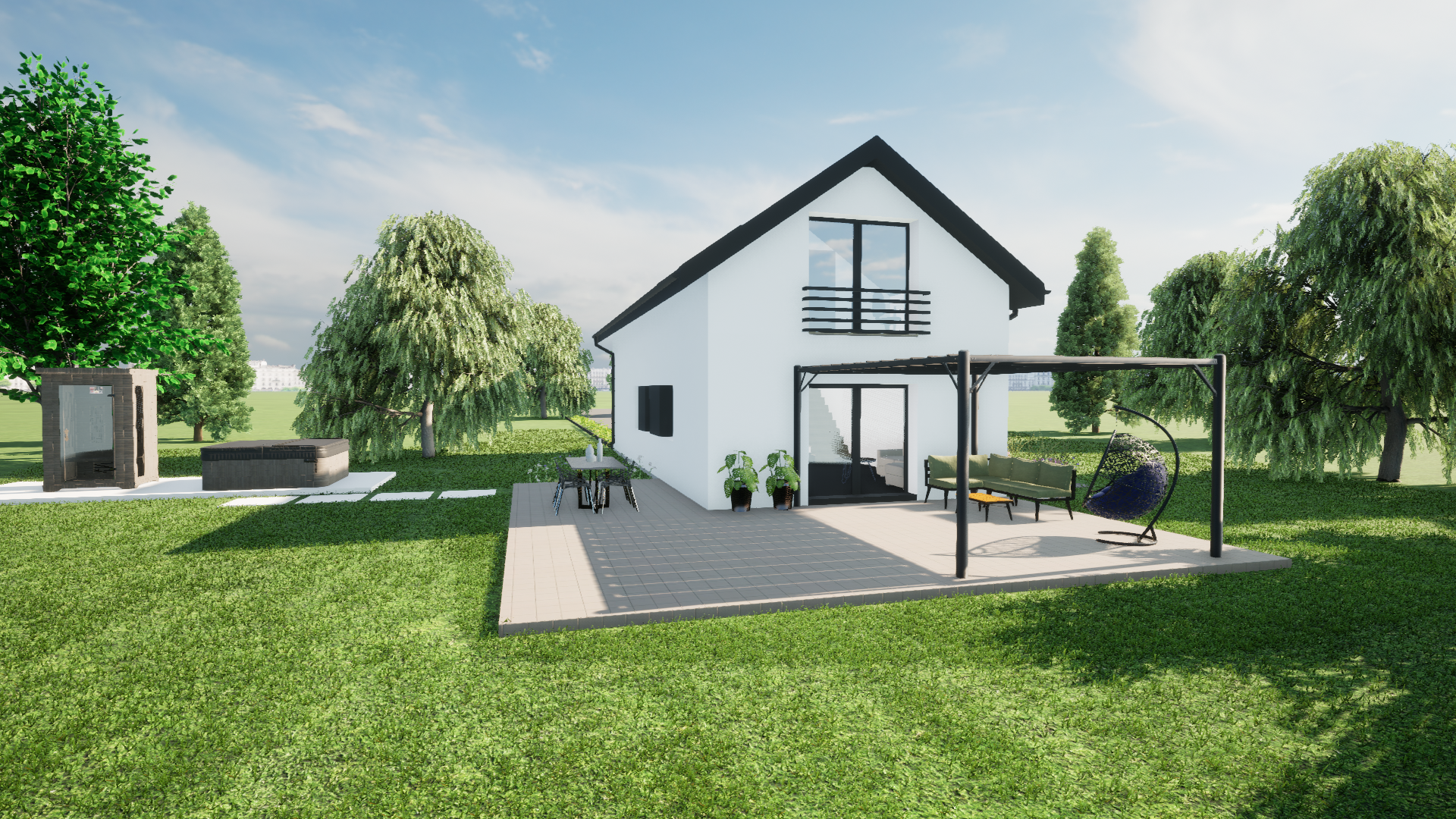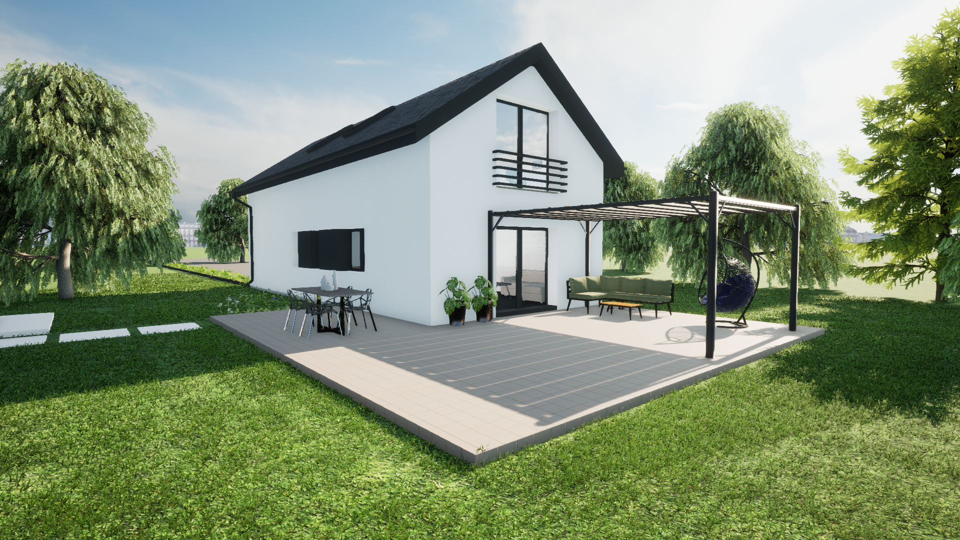 jako dom całoroczny z nowoczesną bryłą i możliwością stworzenia wygodnej strefy tarasowej oraz zadaszenia miejsca postojowego