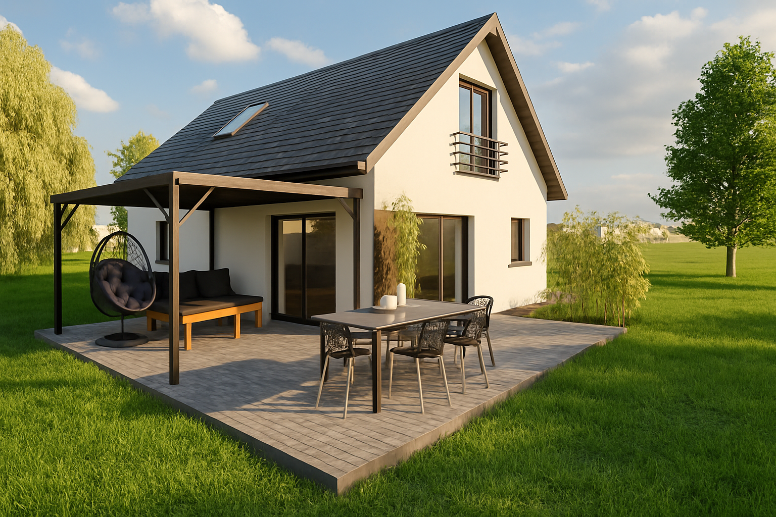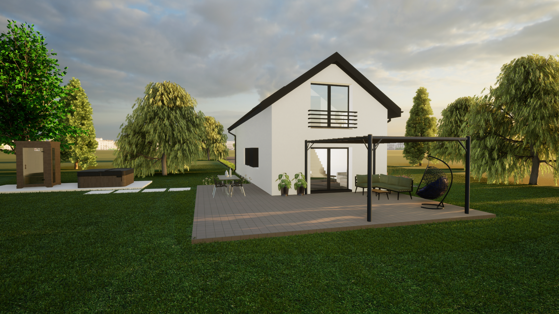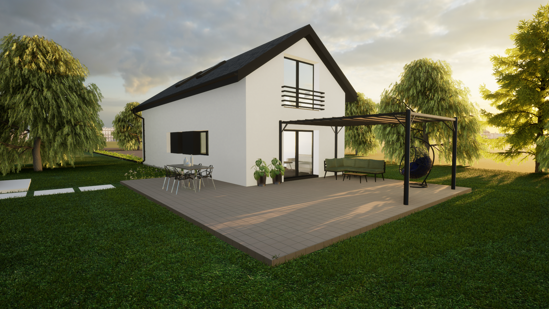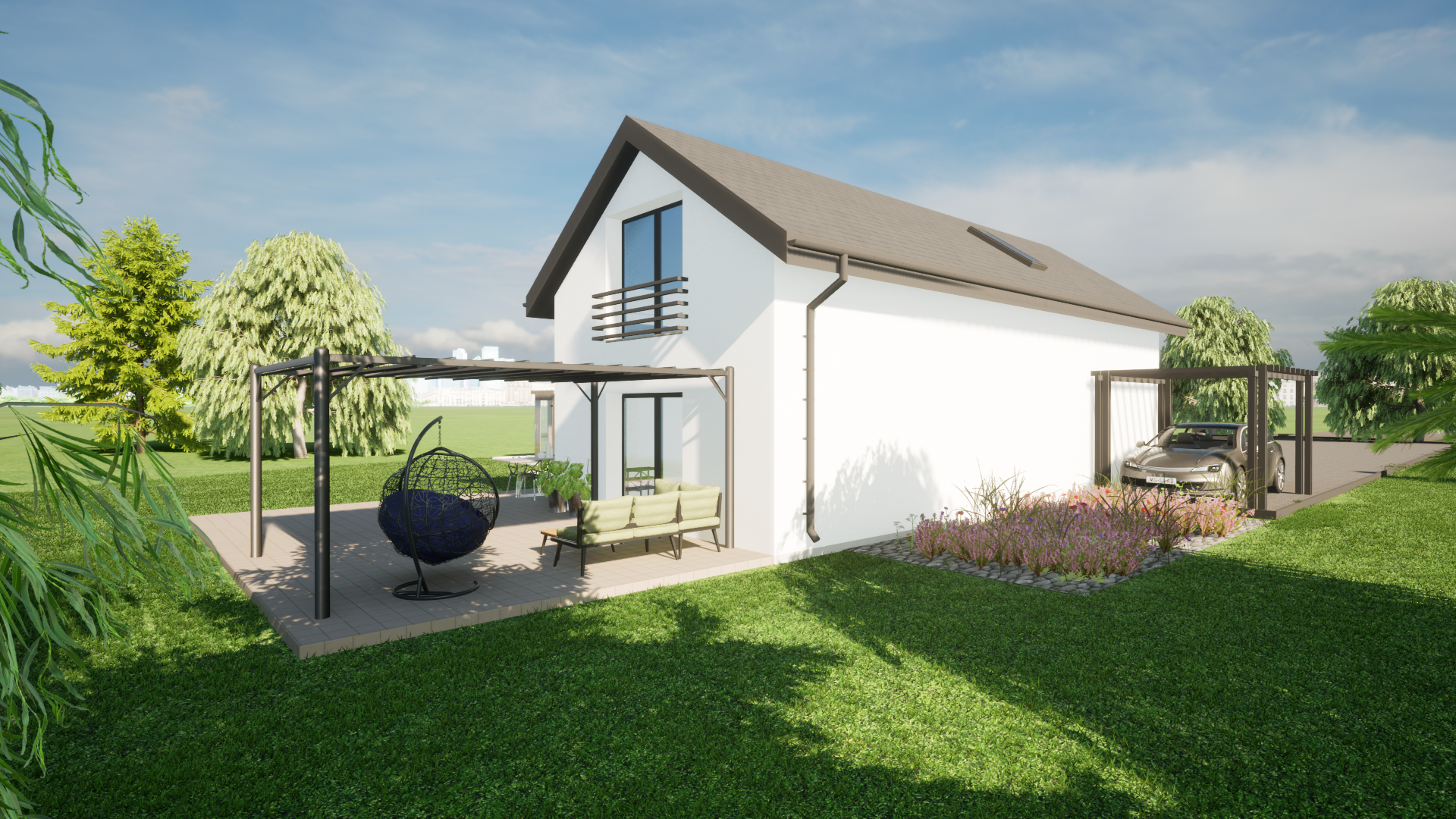 jako dom całoroczny z nowoczesną bryłą i możliwością stworzenia wygodnej strefy tarasowej oraz zadaszenia miejsca postojowego