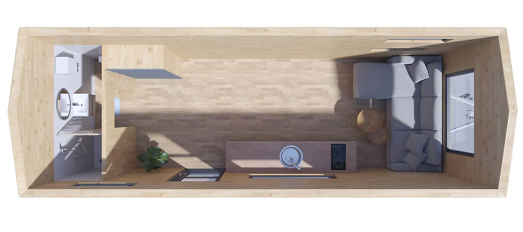 Domki mobilne Family to najbardziej rozbudowana wersja naszych gotowych projektów. Tiny house posiada ergonomiczną łazienkę, otwartą kuchnię oraz salon z kanapą, która może pełnić funkcję spania. Oprócz tego tiny house wyposażony jest w dwie oddzielne antresole, na których zmieszczą się podwójne materace.