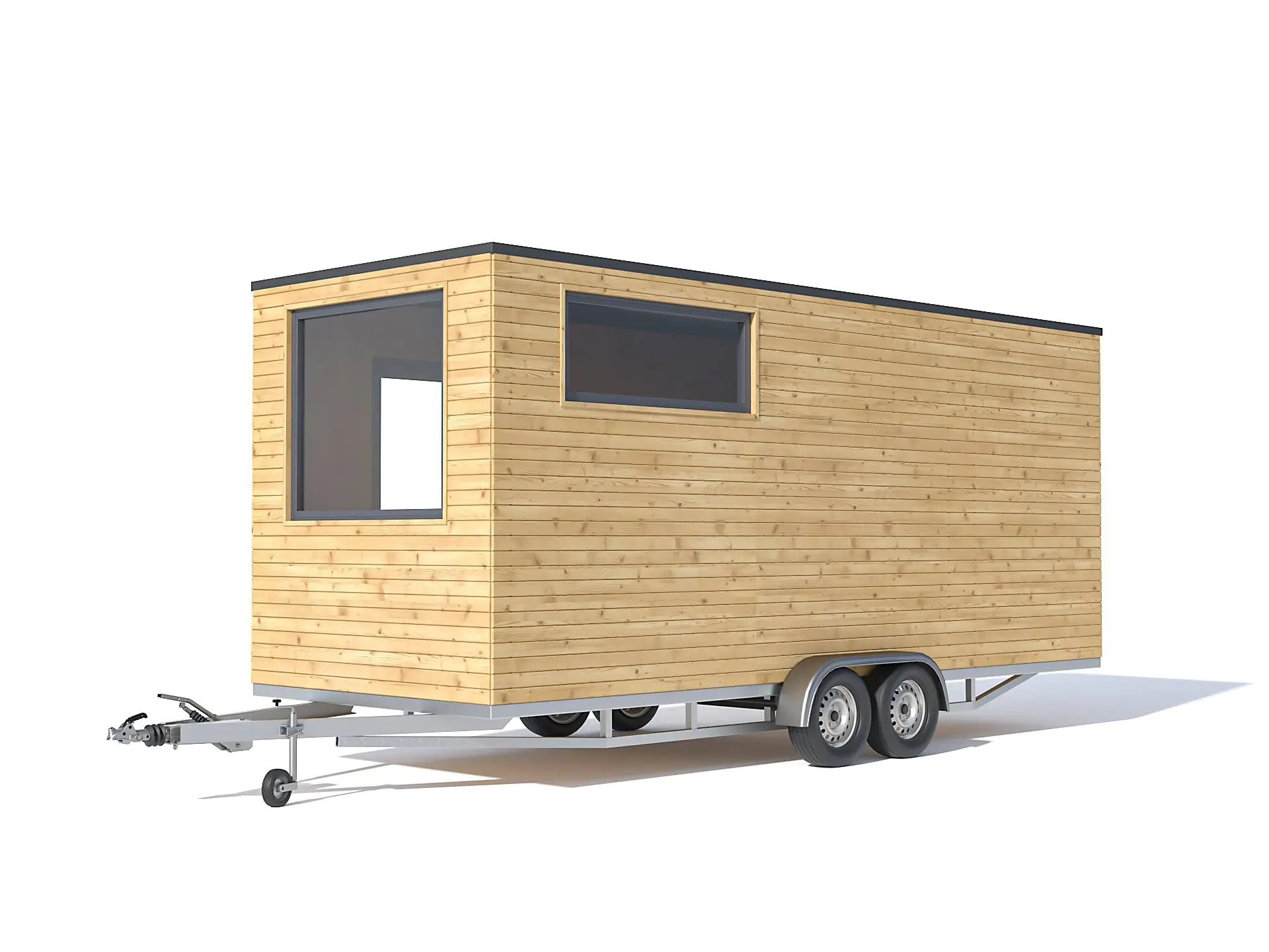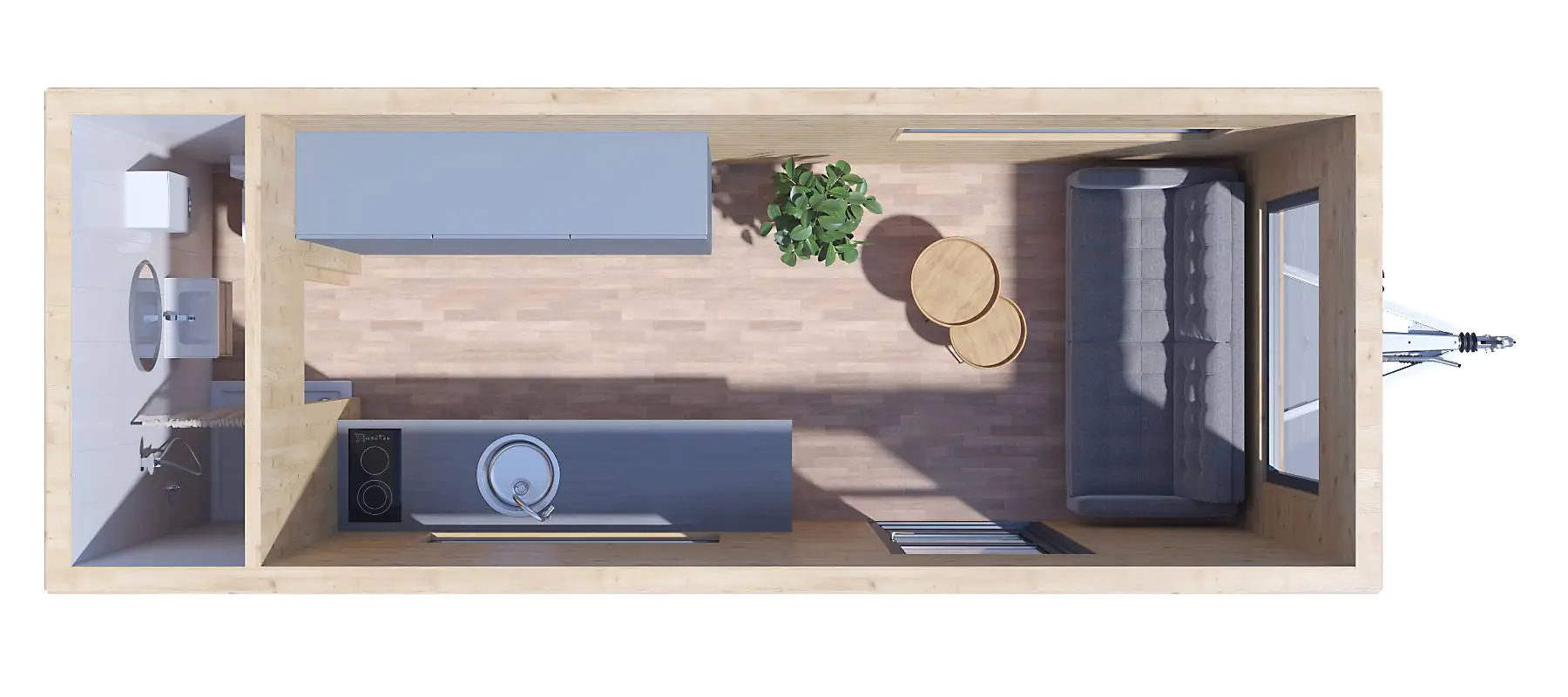 Konstrukcja ta wyróżnia się płaskim dachem, dzięki czemu górę domku można przeznaczyć na dodatkowy taras, zwiększając tym samym atrakcyjność tiny house. Natomiast wnętrze, choć niedużych rozmiarów (ok. 15 mkw.), jest zaprojektowane funkcjonalnie i komfortowo. W środku znajdziesz łazienkę z miejscem na prysznic, a także salon z aneksem kuchennym, który pełni również funkcję sypialni.