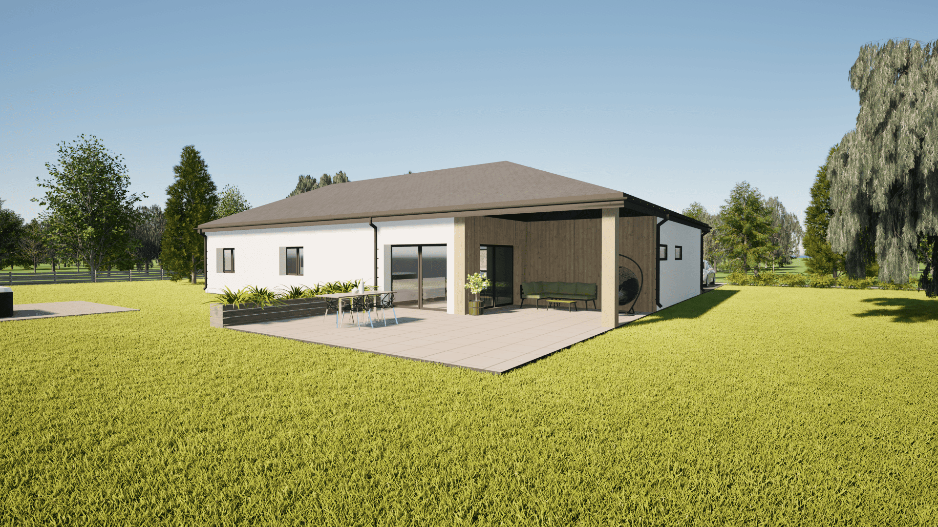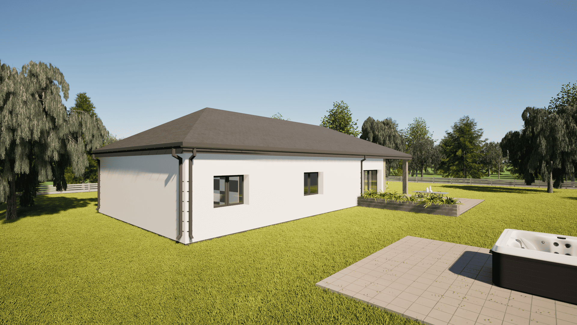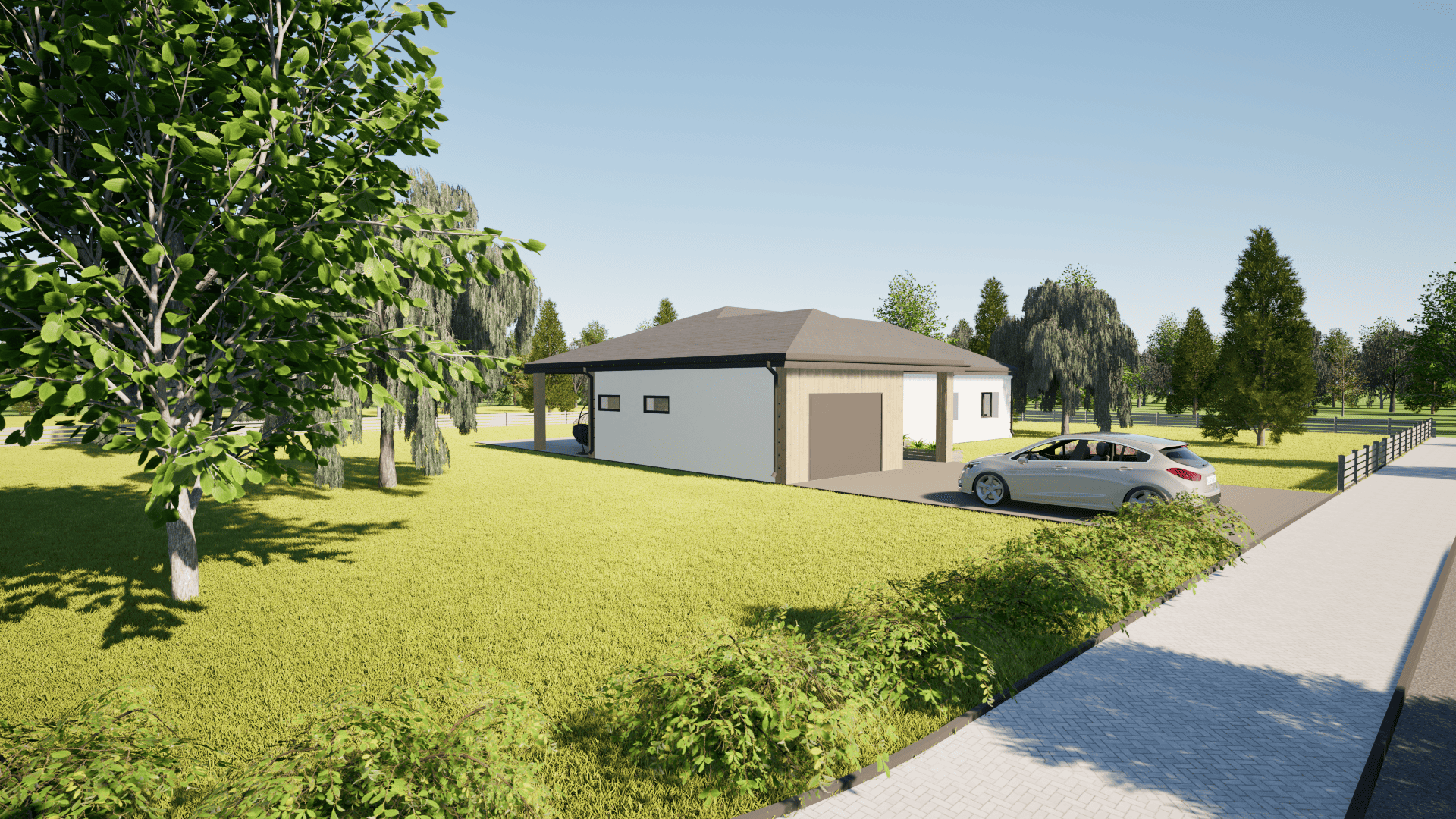 Optima 131 to nowoczesny dom parterowy o eleganckiej, spokojnej bryle z dachem kopertowym i garażem wbudowanym w bryłę budynku. Projekt został zaplanowany tak, aby łączyć reprezentacyjną część dzienną z wygodną strefą prywatną dla rodziny. Duży salon z aneksem kuchennym stanowi serce domu, a praktyczne zaplecze (spiżarka, pomieszczenie techniczne, osobne WC) ułatwia codzienne funkcjonowanie.