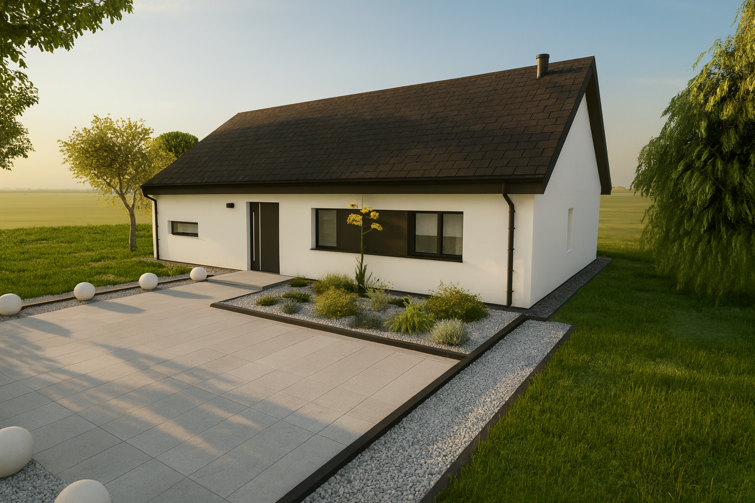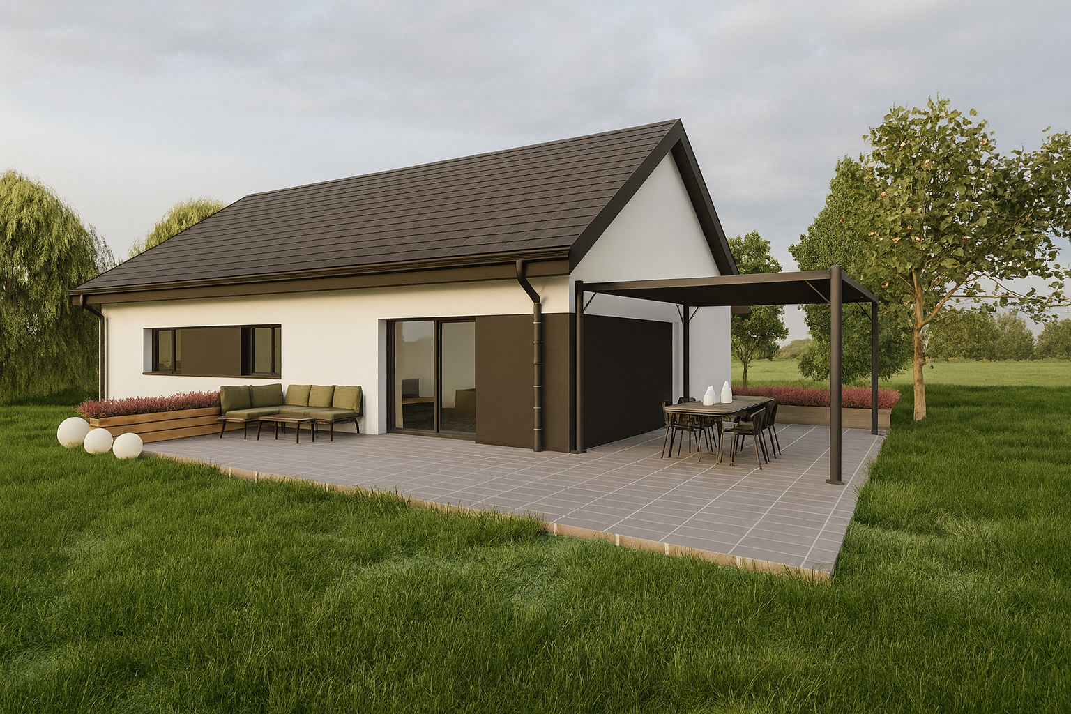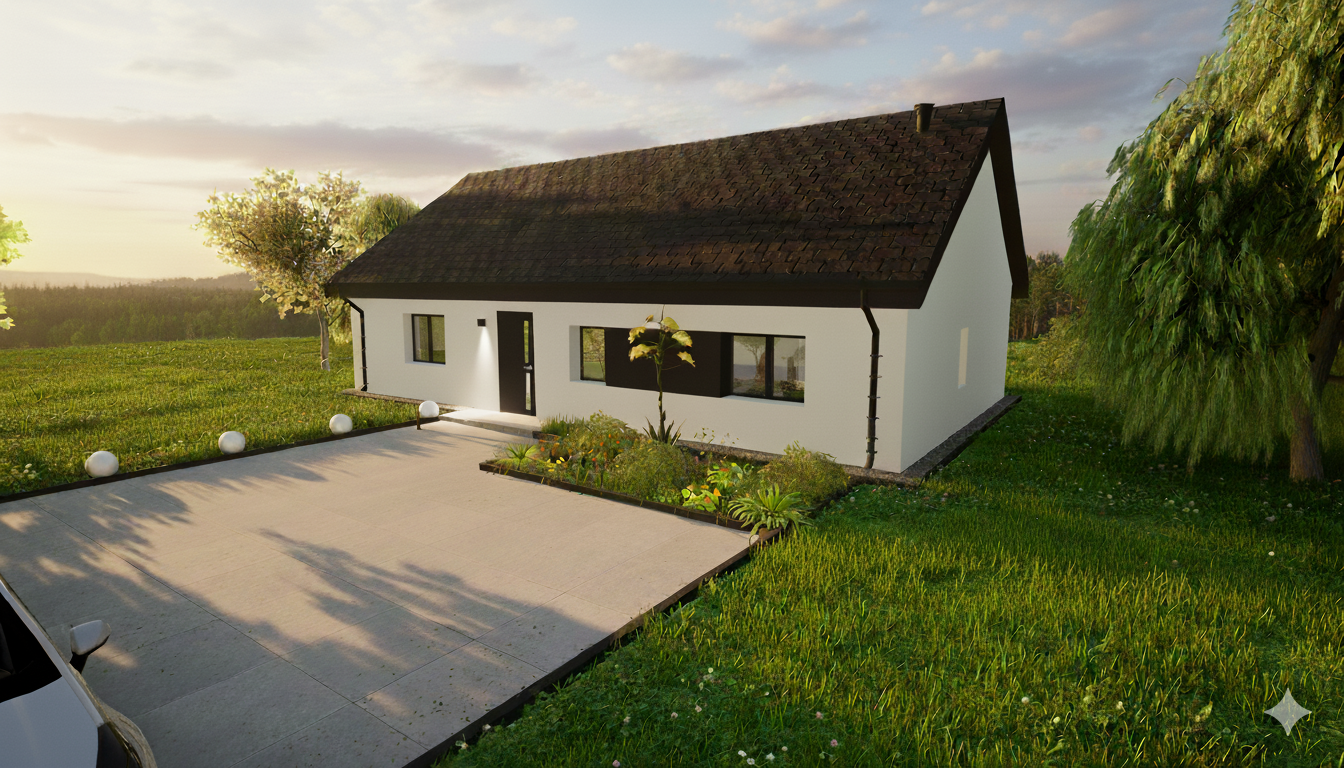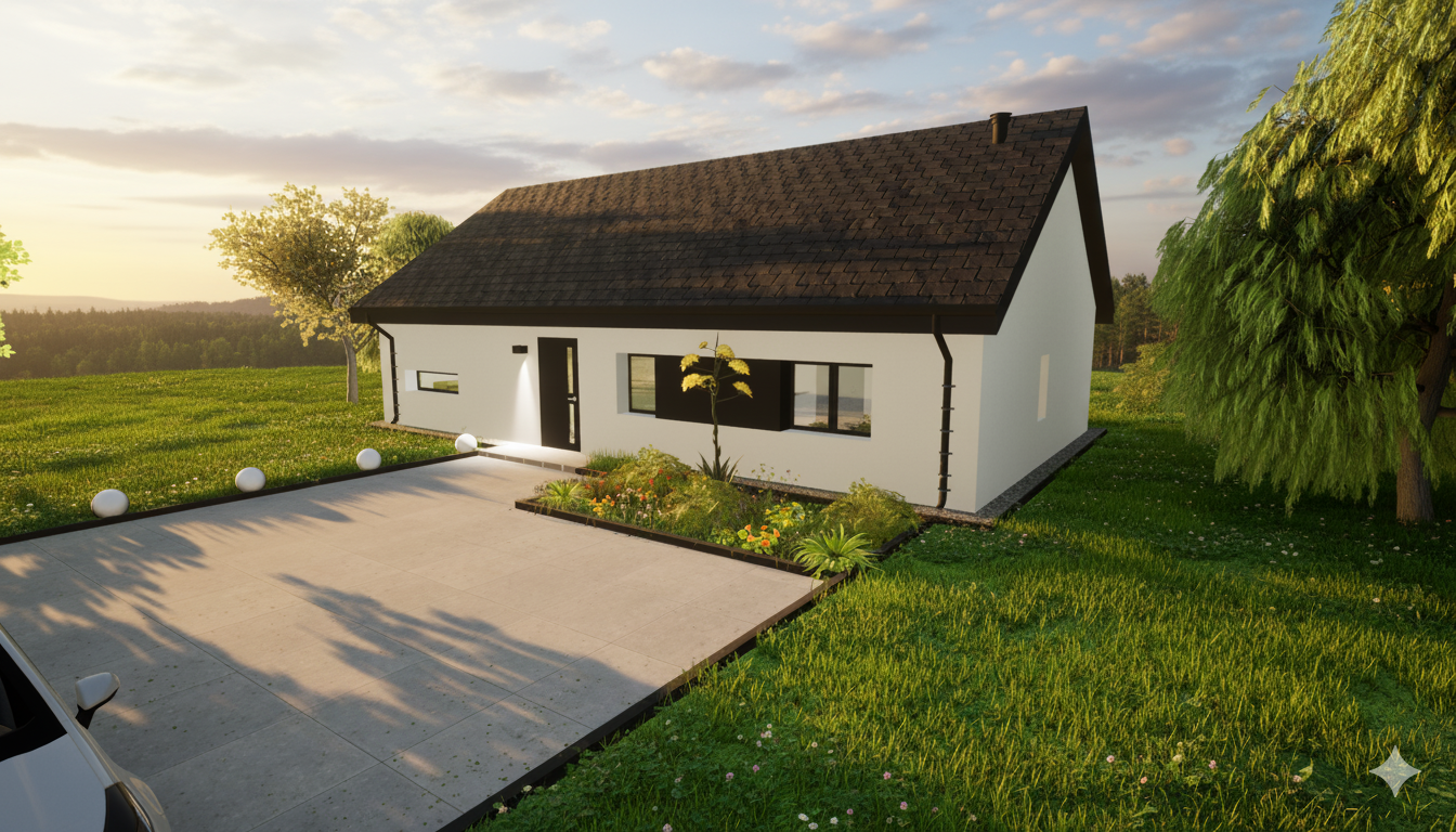 Solo 94 to nowoczesny dom parterowy o prostej, czytelnej bryle, który świetnie sprawdzi się jako dom całoroczny dla 3–5 osób. Wyróżnia go funkcjonalny układ z trzema pokojami (2 pokoje + sypialnia), dwiema strefami sanitarnymi (łazienka i osobne WC) oraz bardzo przestronnym salonem z aneksem kuchennym. To projekt „bez schodów”, nastawiony na wygodę codziennego życia.