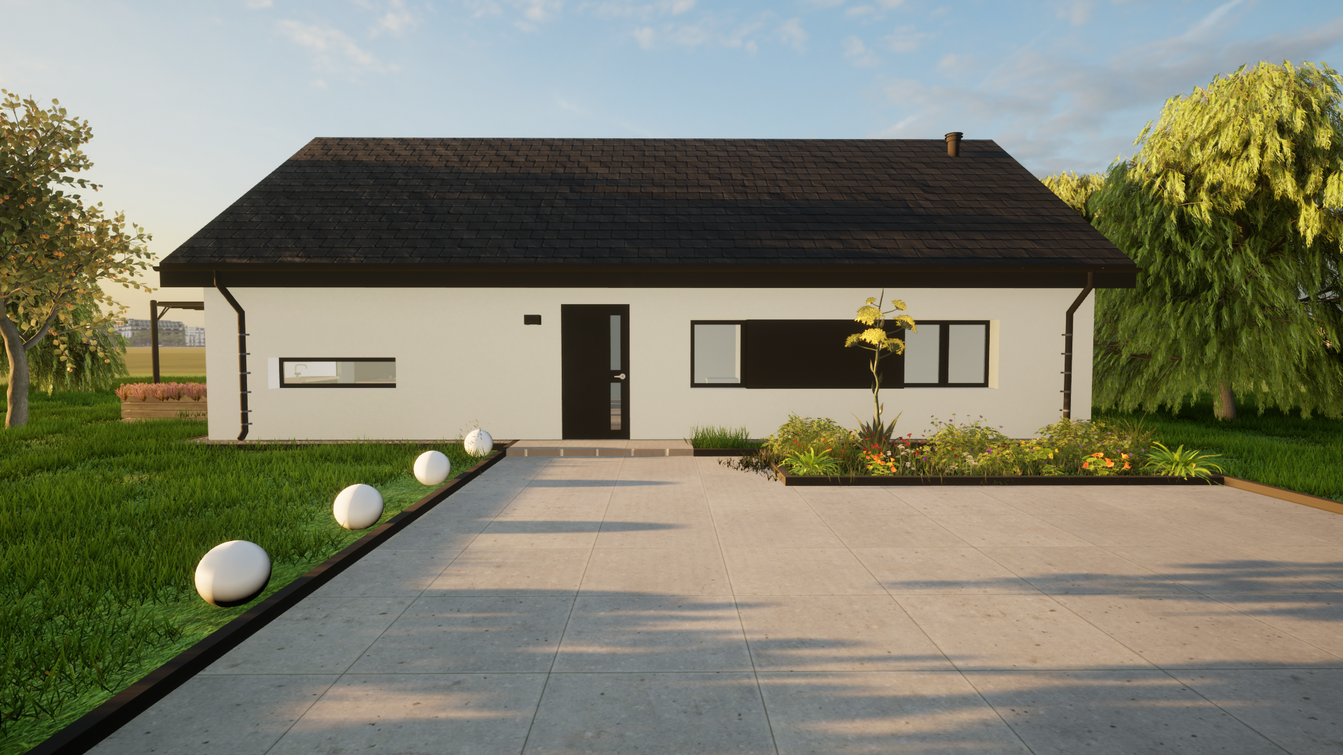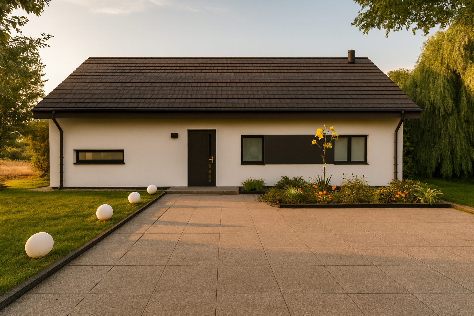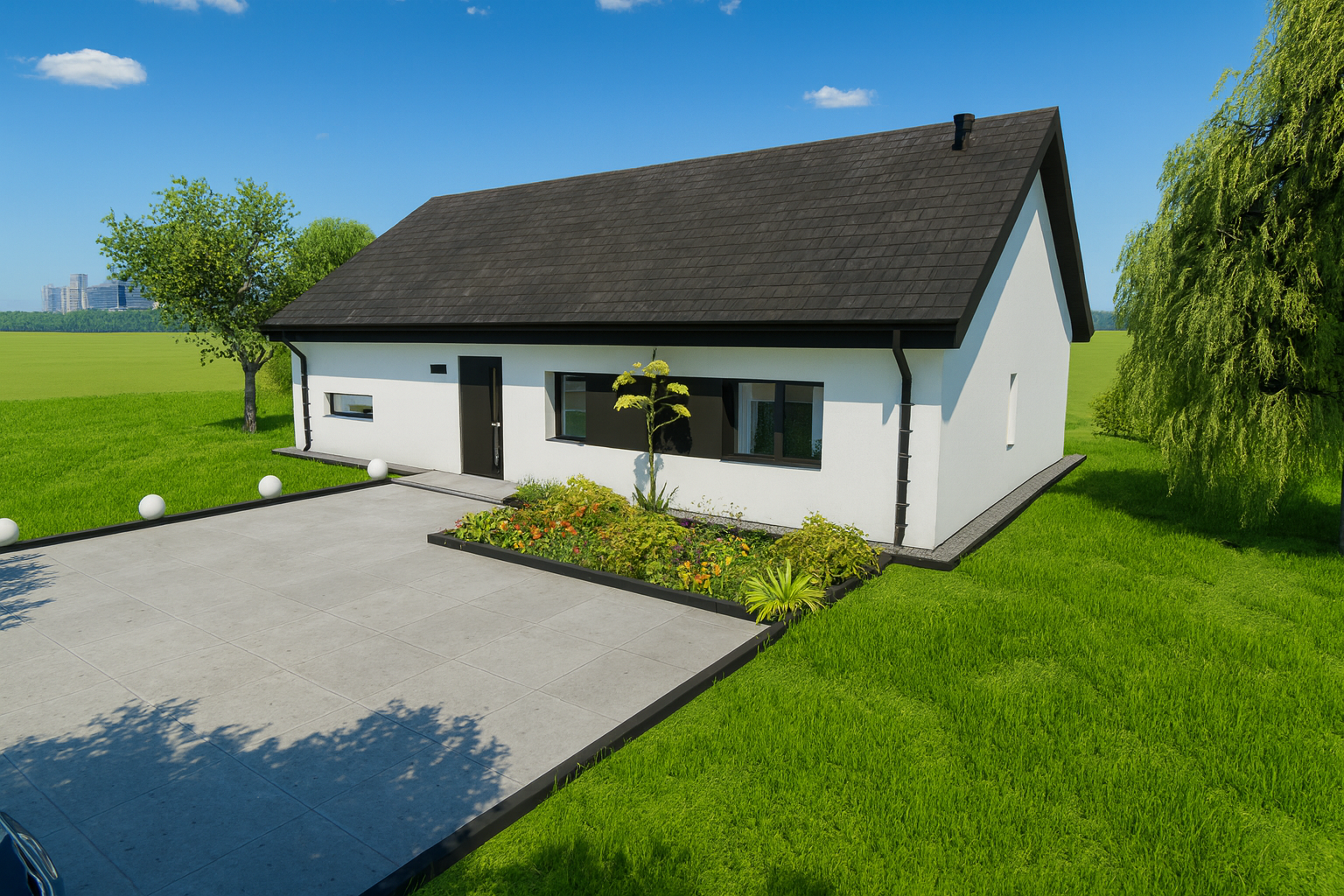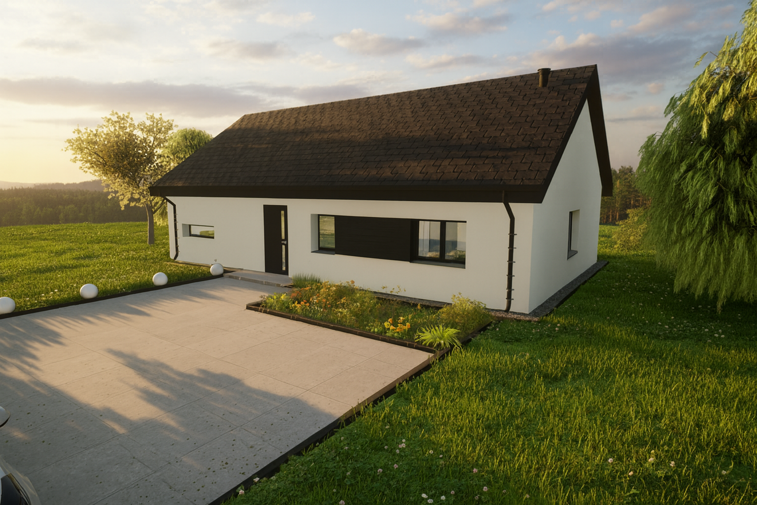 Solo 94 to nowoczesny dom parterowy o prostej, czytelnej bryle, który świetnie sprawdzi się jako dom całoroczny dla 3–5 osób. Wyróżnia go funkcjonalny układ z trzema pokojami (2 pokoje + sypialnia), dwiema strefami sanitarnymi (łazienka i osobne WC) oraz bardzo przestronnym salonem z aneksem kuchennym. To projekt „bez schodów”, nastawiony na wygodę codziennego życia.