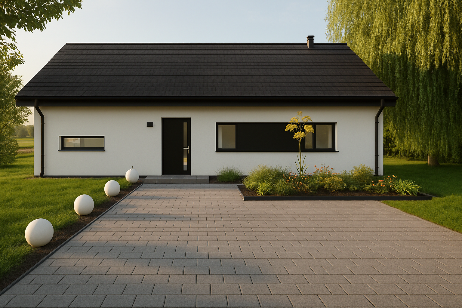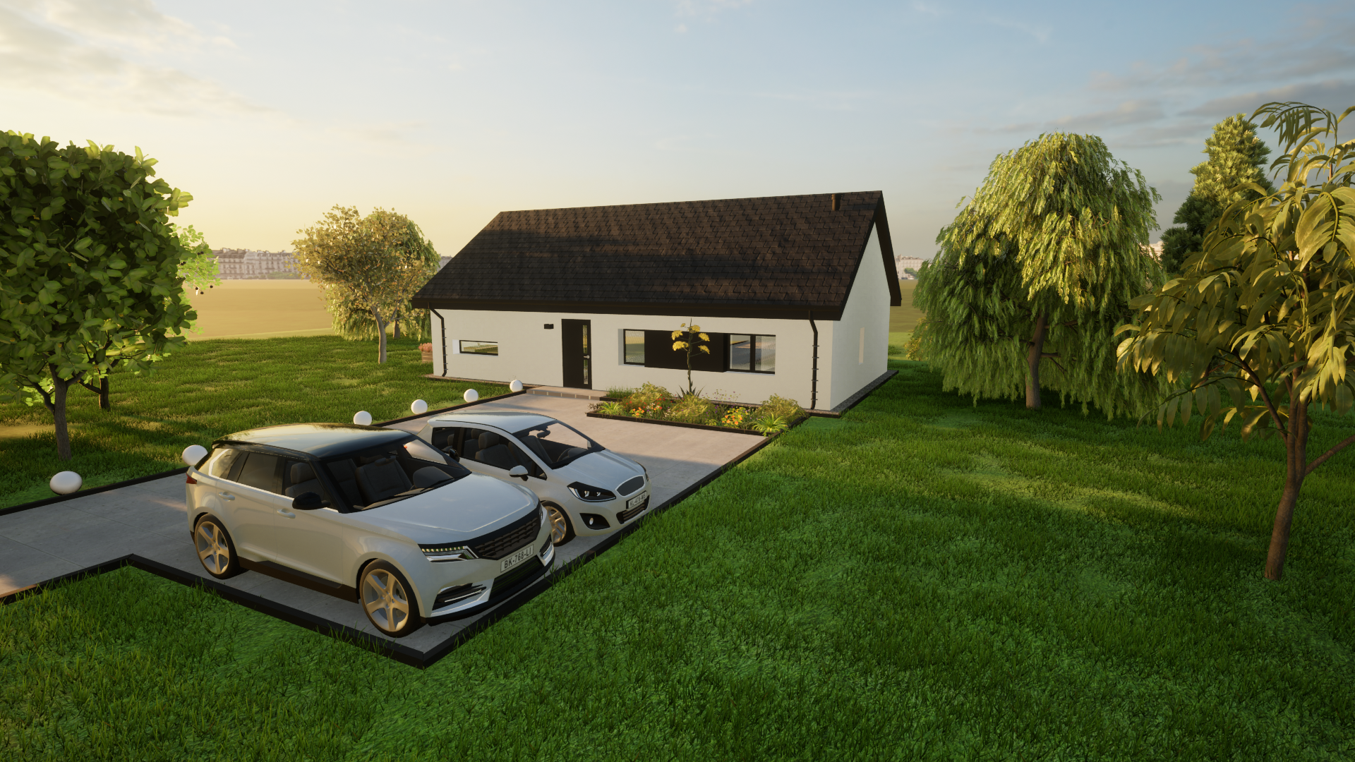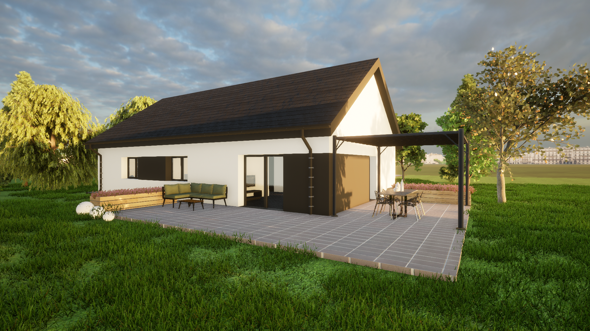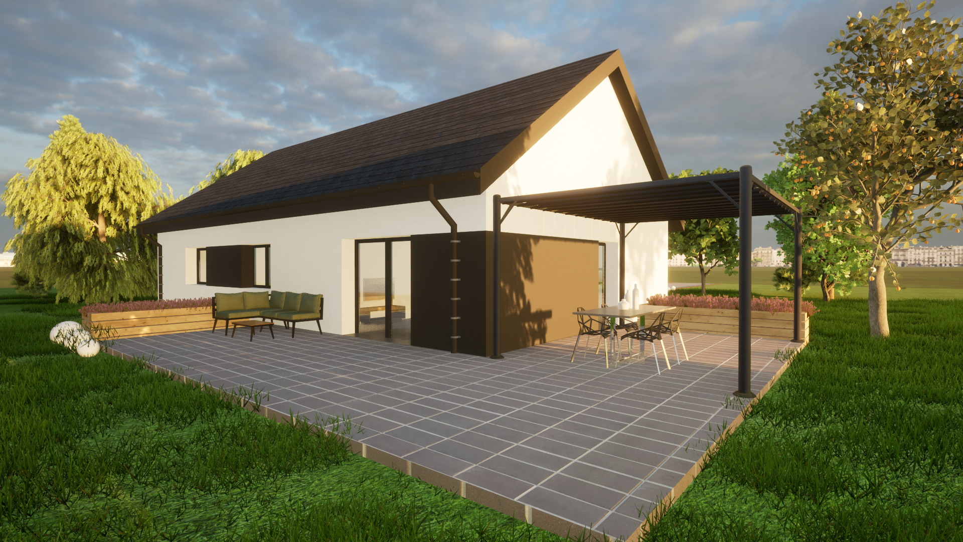 Solo 94 to nowoczesny dom parterowy o prostej, czytelnej bryle, który świetnie sprawdzi się jako dom całoroczny dla 3–5 osób. Wyróżnia go funkcjonalny układ z trzema pokojami (2 pokoje + sypialnia), dwiema strefami sanitarnymi (łazienka i osobne WC) oraz bardzo przestronnym salonem z aneksem kuchennym. To projekt „bez schodów”, nastawiony na wygodę codziennego życia.