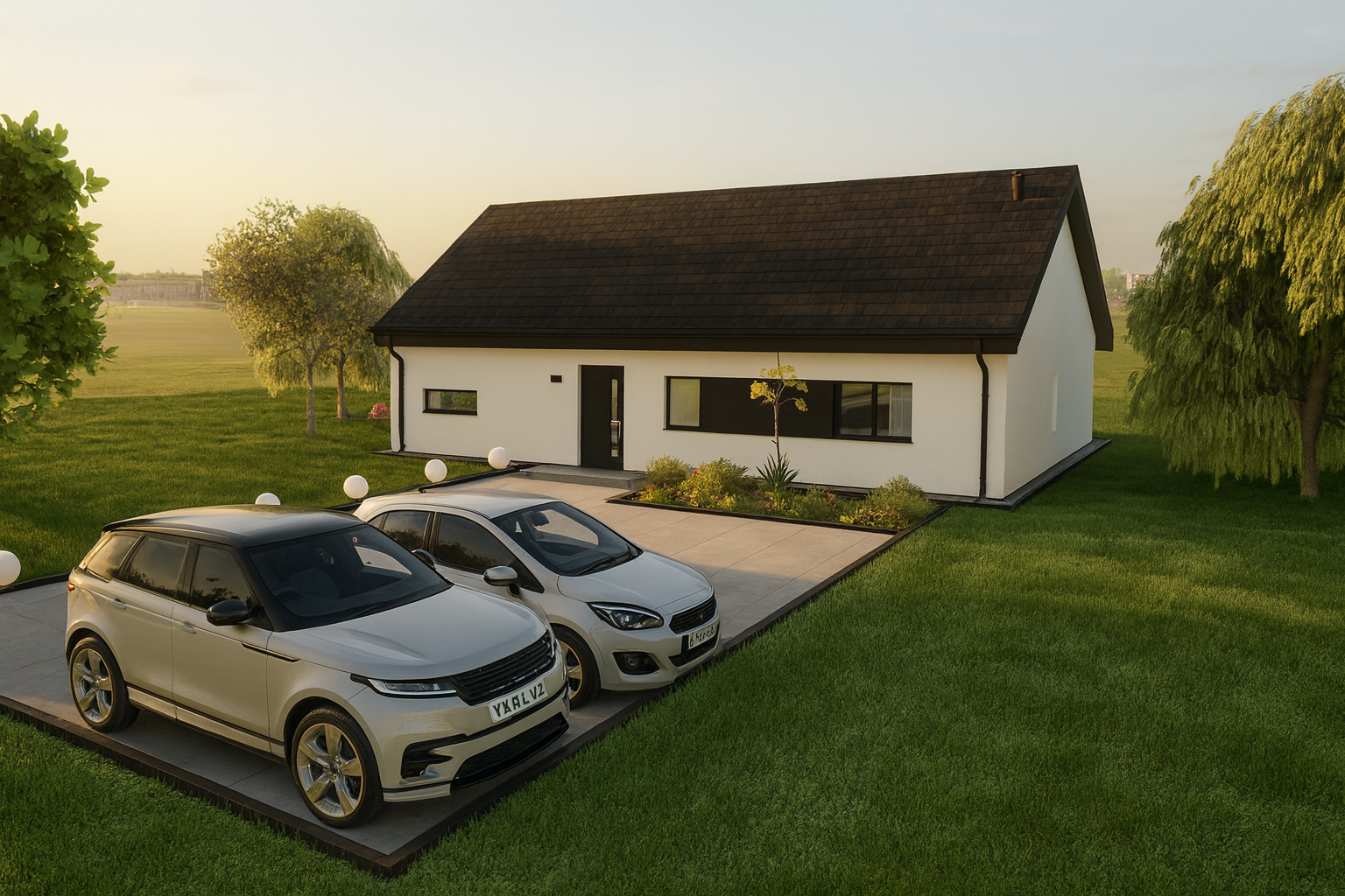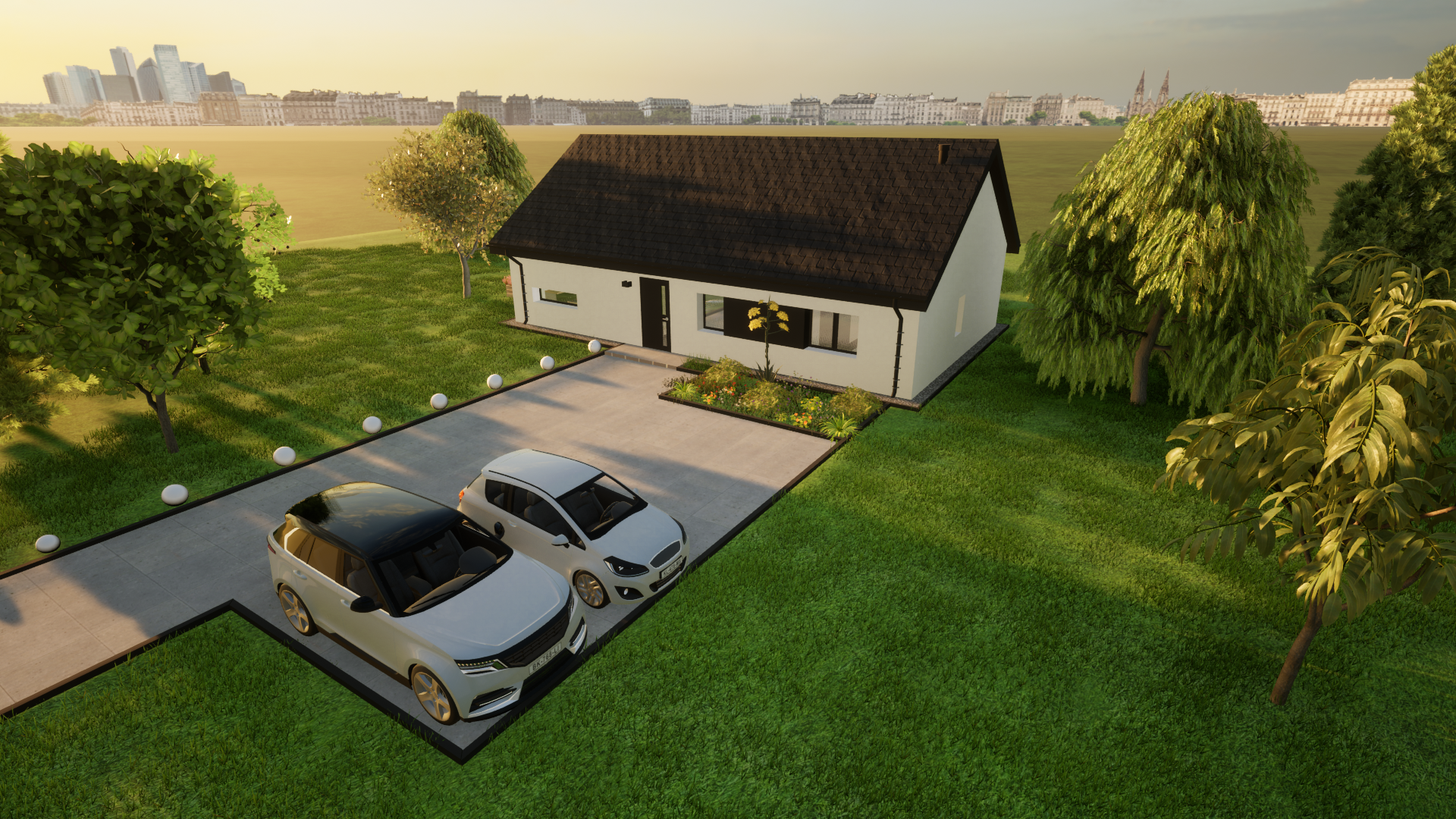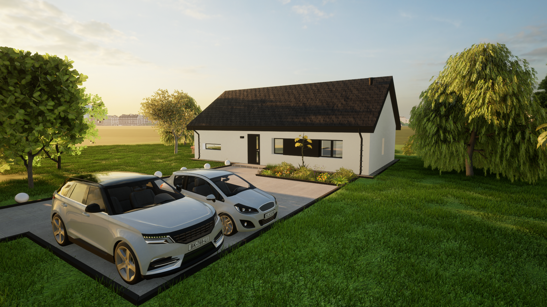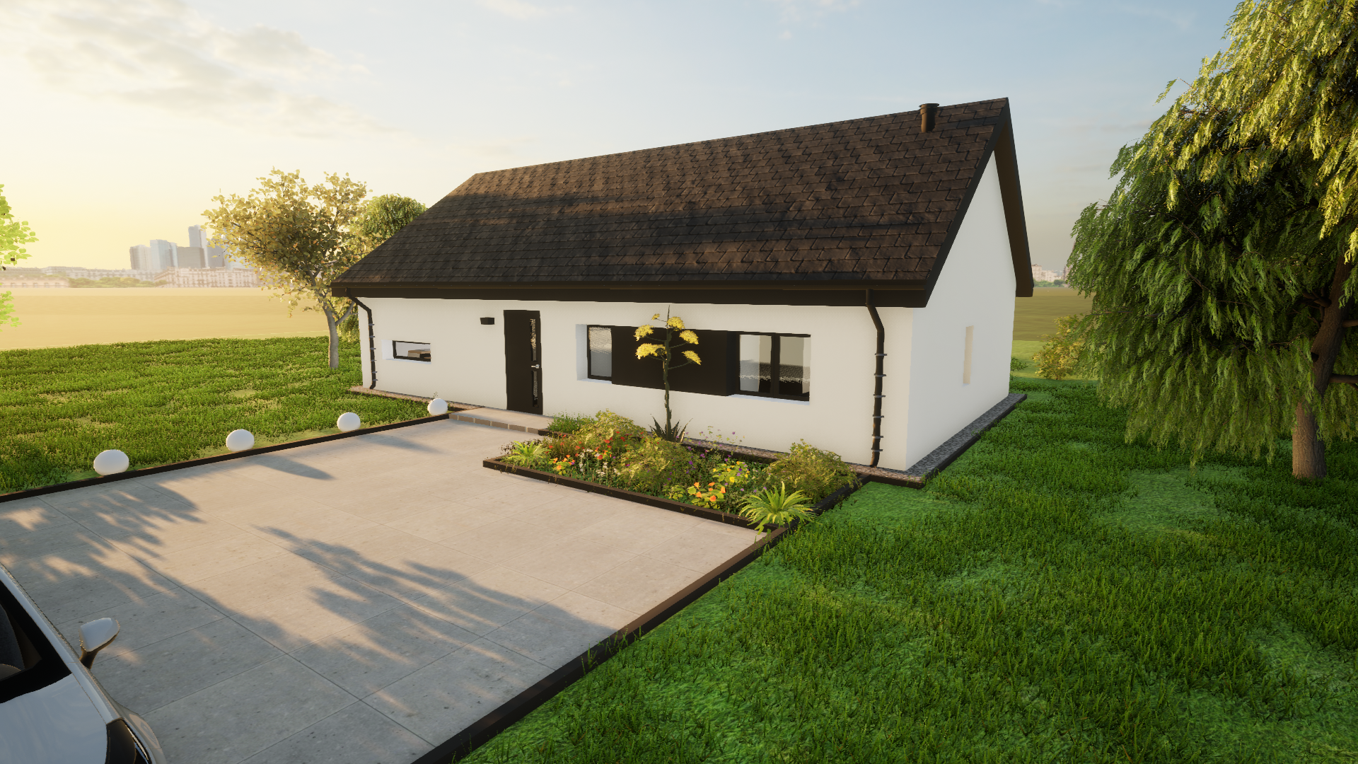 Solo 94 to nowoczesny dom parterowy o prostej, czytelnej bryle, który świetnie sprawdzi się jako dom całoroczny dla 3–5 osób. Wyróżnia go funkcjonalny układ z trzema pokojami (2 pokoje + sypialnia), dwiema strefami sanitarnymi (łazienka i osobne WC) oraz bardzo przestronnym salonem z aneksem kuchennym. To projekt „bez schodów”, nastawiony na wygodę codziennego życia.